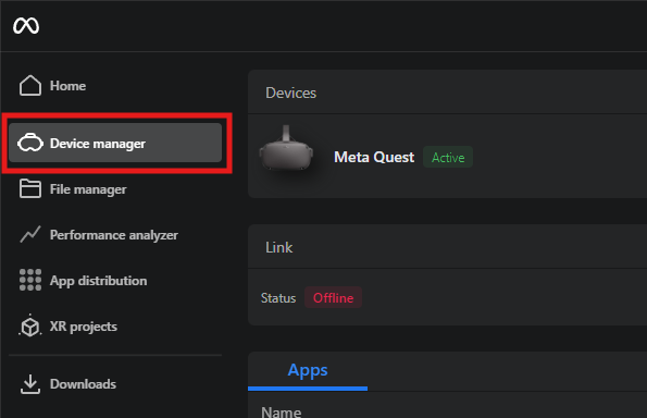 3.Launch the Meta Developer Hub installed on your PC and verify that the connected Meta Quest is recognized.