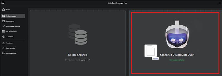 5. Drag and drop the application file (APK format) for CYPE Immersive Viewer provided by our company into the “Connected Device” section displayed in the Device Manager window of the Meta Developer Hub to begin installation.